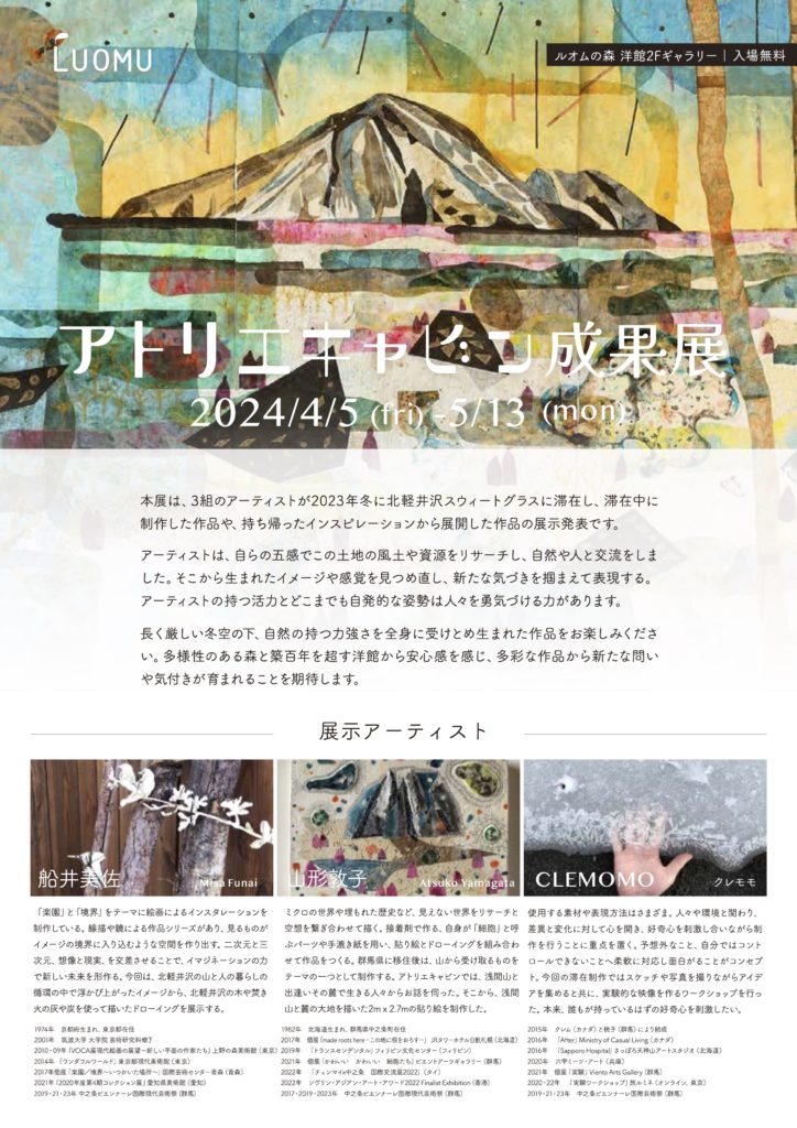 作品はインスタレーション、絵、木工、ワークショップ形式のものなど多岐にわたる。アトリエキャビン2023に参加した作家のうち、現代アートのアーティスト3組が今春、アトリエキャビン成果展に参加する。」